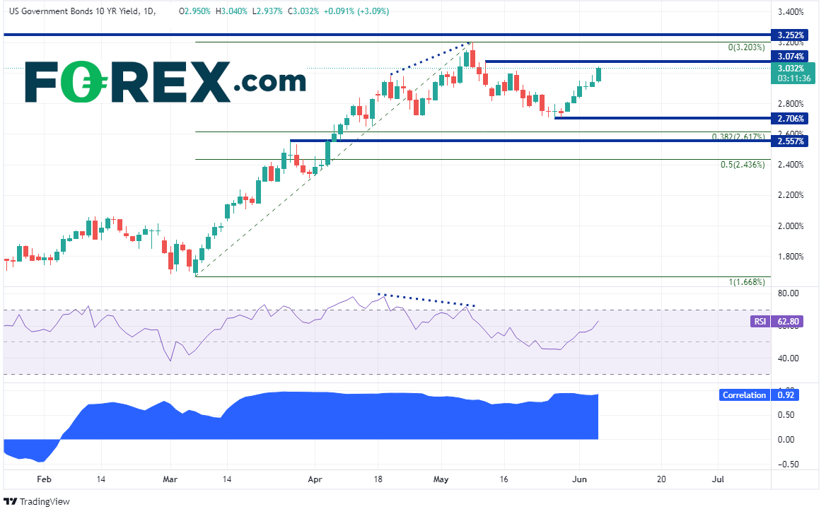 美国10年期国债收益率目前连涨6天。来自中国方面的消息振奋市场信心,进而引发债券抛盘。上海市全面复工复产,而北京市正在解除封控。另外,中国表示,将很快结束对中国版优步滴滴的调查,其应用程序有望很快再度在各大手机平台上线。对此,债券交易者做出抛售债券的决策,导致10年期收益率回到3.00%上方,即5月11日以来最高点3.07%。如果攻克,可能上看5月9日以来高点。如果进一步攻克,可摸至2018年11月以来最高点3.25%。如果受挫回落,价格可能跌至5月26日低点支撑2.71%、3月7日低点到5月9日高点行情的38.2%回档位2.62%、水平支撑位2.56%。请注意,下图底部展示了美国10年期国债收益率与美元/日元之间的关系,两者当前相关系数高达+0.92,呈现出高度正相关联系。如果收益率继续上涨,美元/日元应可随之走高。