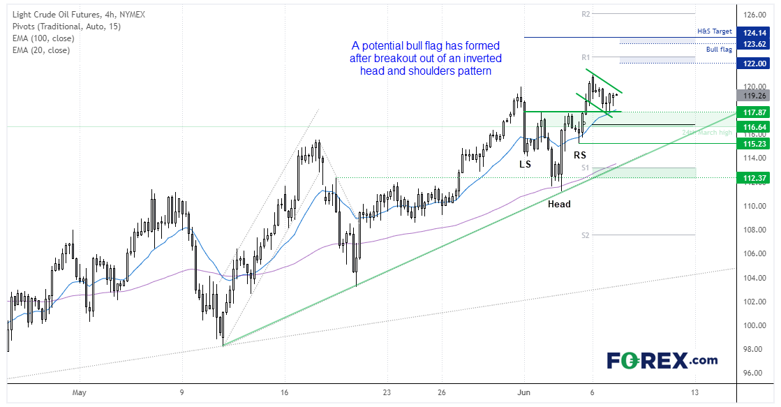 而且,价格有可能形成看涨旗形并且目前守住117。该形态的测量目标恰巧也在头肩底形态附近。展望后市,如果直接上破,可能确认看涨旗形形态,并且守住昨天低点我们继续看涨,短线先后上看122和124阻力区域。