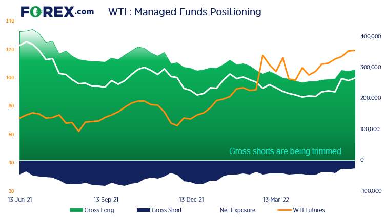西得州原油本周强劲开局。有报道称,沙特阿拉伯将上调7月原油销售价格,与OPEC最近增产的决定 – 此举被视为有助于平抑通胀 - 背道而驰。但沙特上调油价也确认了原油需求依然旺盛。中国复工复产、美国处于驾车出游季以及俄罗斯与西方国家持续紧张的关系,都支持油价上涨,沙特上调原油售价更是帮助油价在周一开盘跳空上涨2美元,摸至13周高点。再看持仓数据,我们发现基金经理人似乎认可价格的上升。