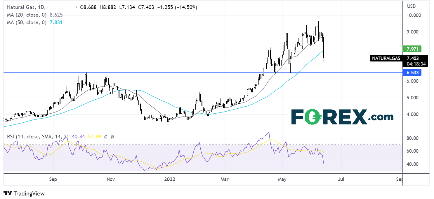 天然气价格业已暴跌14%,击穿了20与50期均线,后于7.134遇阻。这是天然气价格1月底以来首度跌破50期均线,叠加RSI看跌,后市或扩大下行。