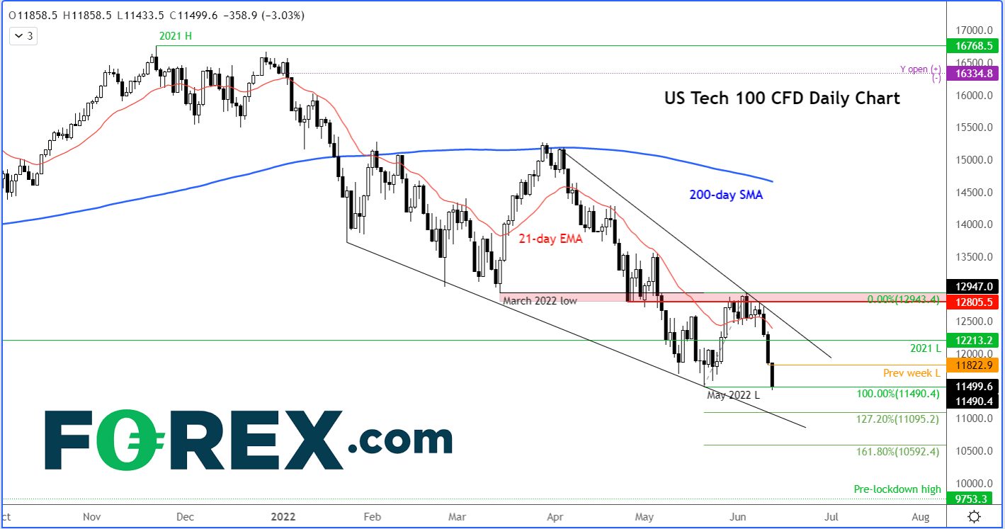 随着纳斯达克期货跌幅超过3%,该科技股权重股指已下穿5月低点,探入今年以来新低。纳斯达克指数此前已回吐2021年全部涨幅,现正磨平2020年涨幅。
