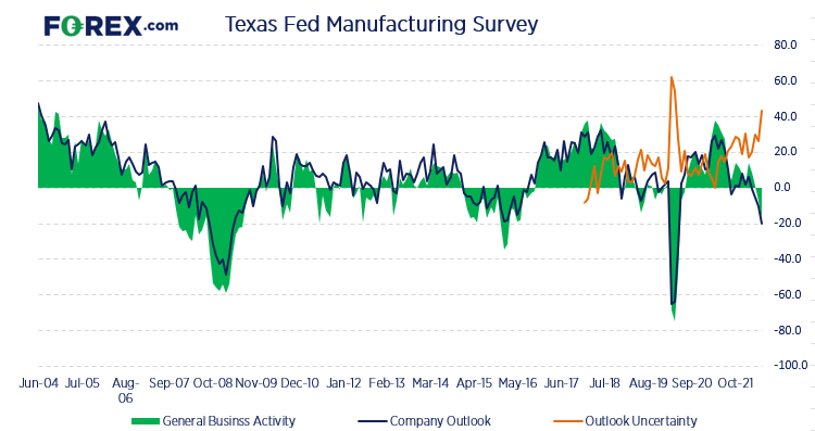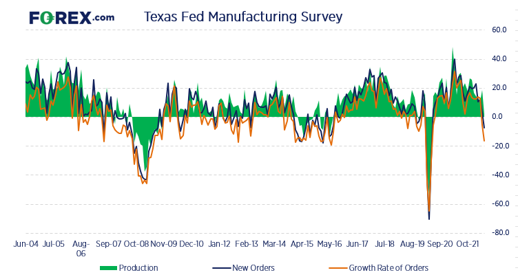 德克萨斯联储企业展望调查报告表现黯淡,其中新订单与订单增长率萎缩而产出指数处于2019年10月以来最低点(几乎没有扩张),装船也跌至2年低点并且交货时间间隔增加15.6点(为14个月最大增幅),表明供应链依然运行不畅,也许该问题从未真正消失。