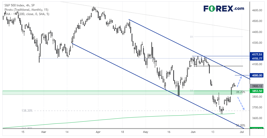 在那之前我们可望看到标普500指数扩大上行。该股指目前交投于下跌通道内,但正处于对其(可以说超卖的)下跌趋势展开回调的进程中。支撑位在200周指数移动均线,站于其上后攻克3850阻力区域,使其现在可能转变为支撑。股指正上看4000或上轨趋势线。而若下破3800,或表明动能回归下跌趋势。