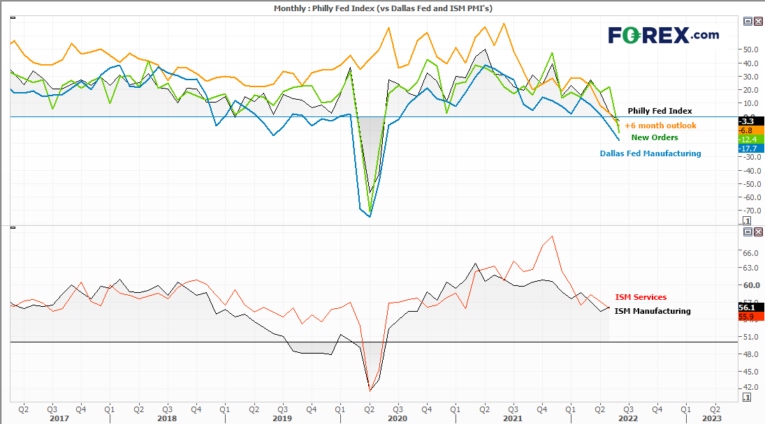 上述报告呼应了上周公布的费城联储制造业指数。也就是说,部分地区不仅信心萎靡并且快速恶化,最终可能波及将要揭晓的全国性PMI报告。美国定于周五发布ISM制造业PMI报告,那是同类商业信心调查报告中历史最悠久的报告,帮助分析师解读当下所处的商业周期并预测未来成长,一直备受瞩目。ISM制造业与服务业指数在2021年一季度触顶后不断下跌,并且区域性报告也暗示其可能在未来数月走向萎缩。