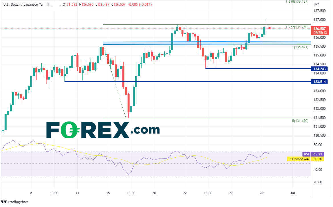 美元/日元再创新高,达到24年最高点。美联储主席在今天于葡萄牙Sintra举行的欧洲央行论坛上表示,美国经济状态强劲,足以应对货币政策的紧缩。美元/日元触及137.00心理整数阻力位,创下1998年9月以来最高点。该货币对刚刚在几天前的6月22日,创下短线高点136.71。