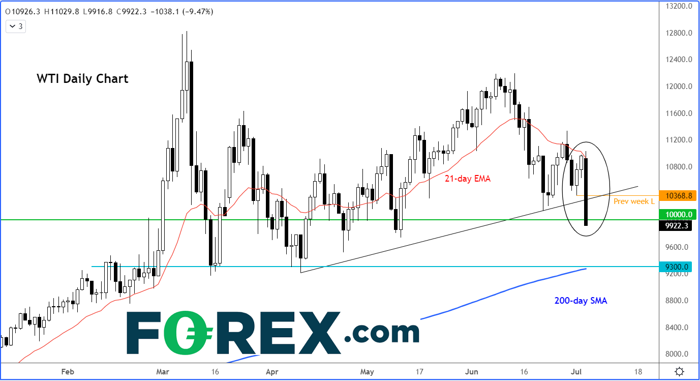上述种种担忧占据了投资者的脑海,油价跌势因此可能持续一段时间。投资者现在更可能逢高沽出而不是逢低买入,在一根趋势线告破的情况下尤其如此。请看下图: