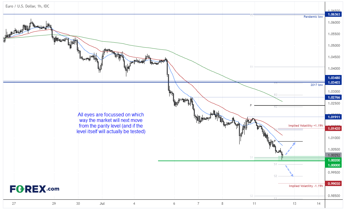 近二十年来欧元/美元的平价时隐时现,现在趋于变成现实。但如果首次考验即屈服,我会感到意外。而且我高度怀疑平价附近筑有丰富的限价买单,伴随着下方不远处的止损单 – 技术面具备第一次反弹的基础。当然,这里的风险在于,如果价格确实下破1.0000,可能触发一些大型止损单后走弱。不论如何突破,1.0000对于欧洲与美国交易者来说都至关重要。