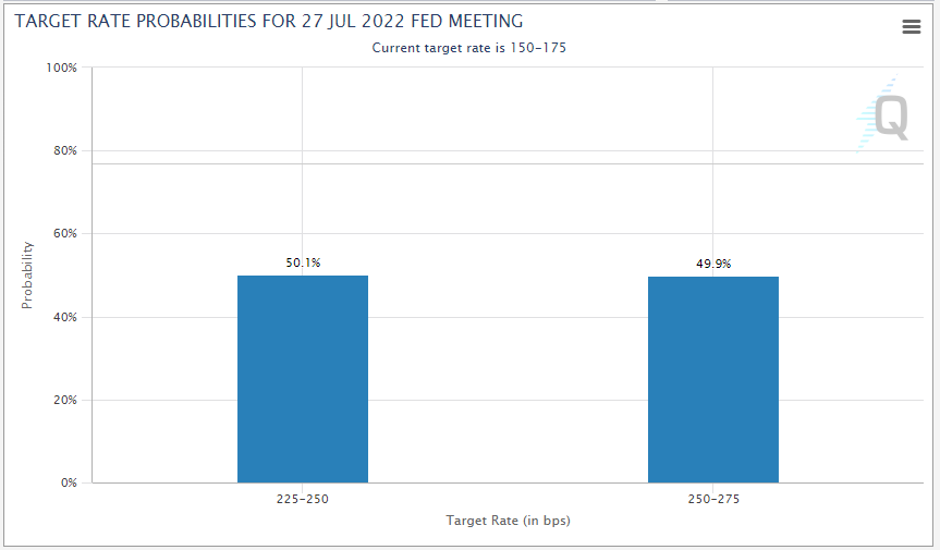 比预期火热的通胀报告的第一阶段效应,从逻辑上来说是推高美联储短期加息的预期。在进入本周时,交易者仅计入2%的几率FOMC在月末加息100个基点。但此文发稿时,硬币翻转到另一面,这个数字超过了50%。请看下图CME FedWatch有关联邦基金期货市场的预期: