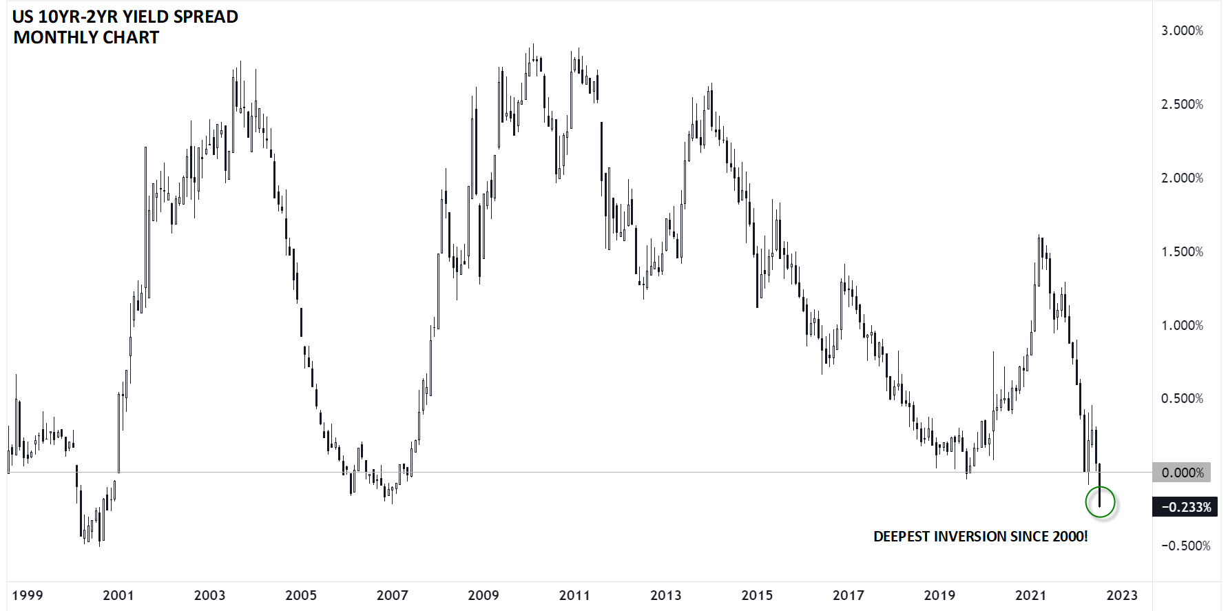 短期债券收益率曲线的走势拥有令人信服的解释,长期收益率本周的走势可以说是不详之兆:10年期美债收益率在美国CPI报告发布后基本走平,推动10年期-2年期收益率差低至-25个基点,为2000年四季度以来倒挂情况最严重的一次。
