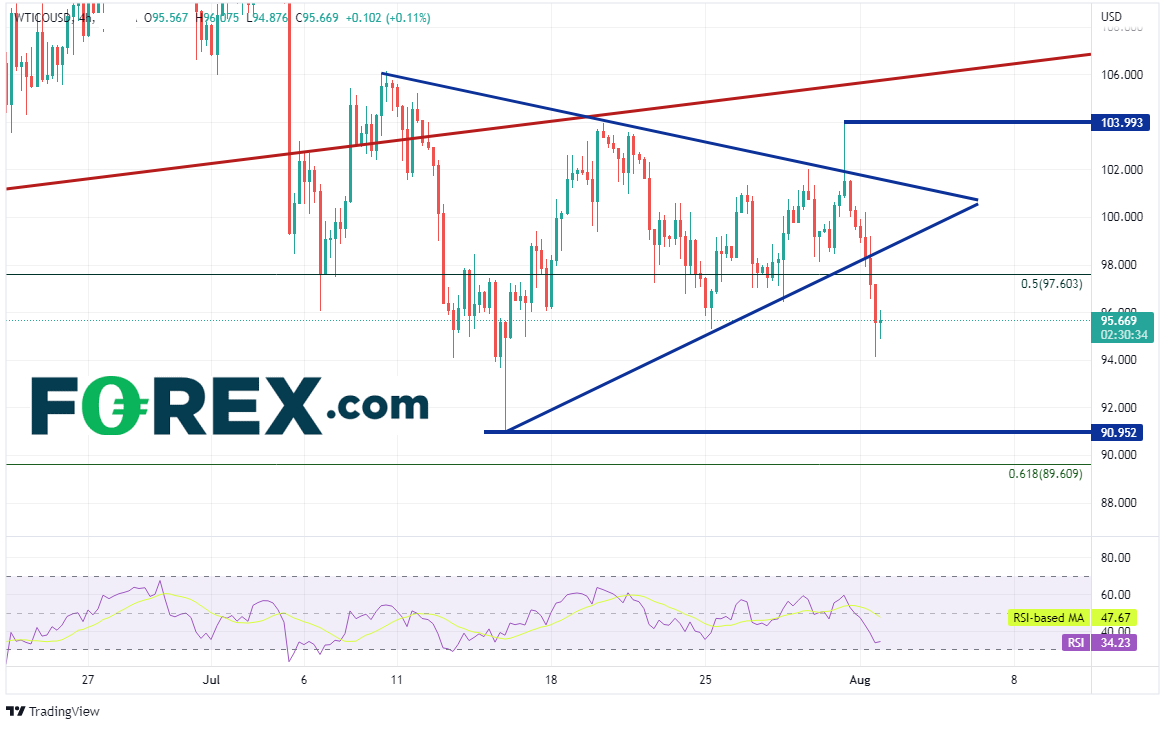 接连遭到中美负面制造业数据的打击,西得州原油价格不断下跌,当天跌幅接近5%。而供应端的OPEC+会议可能“保持不变或略微增产”前景,同样无助于支撑油价。如果西得州油价无法回到短期对称三角形的下轨趋势线所在的98.50附近之上,后市或一路下滑至7月14日低点90.95。