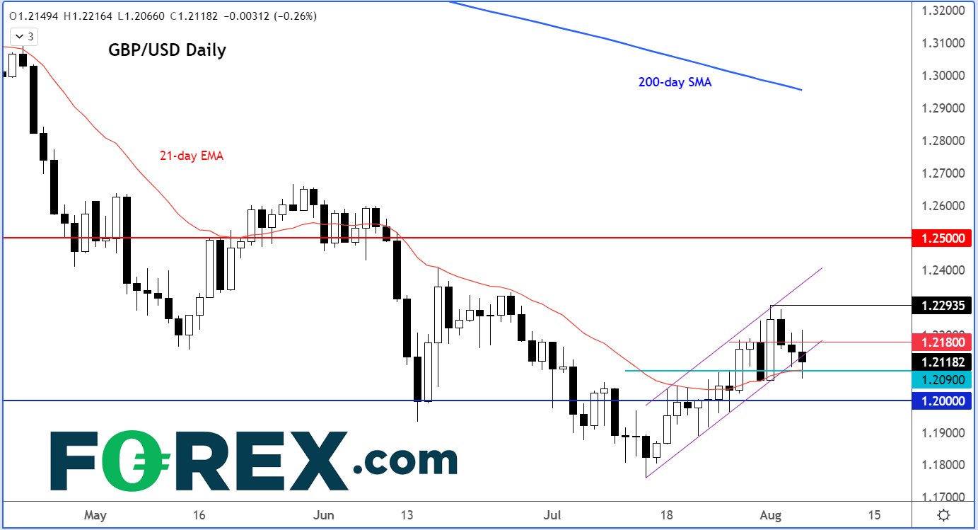 英镑下滑。英国央行一如市场预期加息50个基点,至1.75%。但央行发布了极为黯淡的成长预测,并且预计通胀率将创下两位数。英镑/美元应声跌破1.21整数关口,之后略有反弹。在7月非农就业报告于周五揭晓之前,美国公布了多个疲软的就业报告,导致美元全线下挫。进入美国时段时,其它英镑交叉盘仍处于时段低点附近。
