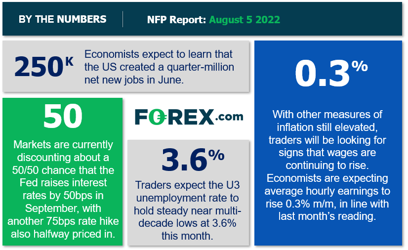我们在上个月的非农就业前瞻报告中指出,美国就业市场“仍在持续、稳定地创造新的就业岗位,雇主竞相提供有竞争力的薪资,吸引人才。美联储在这样的背景下致力于快速紧缩银根,以保证通胀不会在与薪资螺旋式上升中互相纠缠,变得难以根除”。这句话一定程度上仍然是正确的,但我们要指出,交易员与经济学家目前预期美国就业增长速度显著下降:对于7月非农就业报告的主流预期值是,仅新增25万,而平均每小时收入月率增长0.3%。