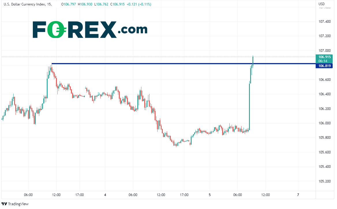 美元闻讯起飞。在美联储将继续积极加息的观点作用下,美元指数大举冲高,击穿了8月3日高点106.82。