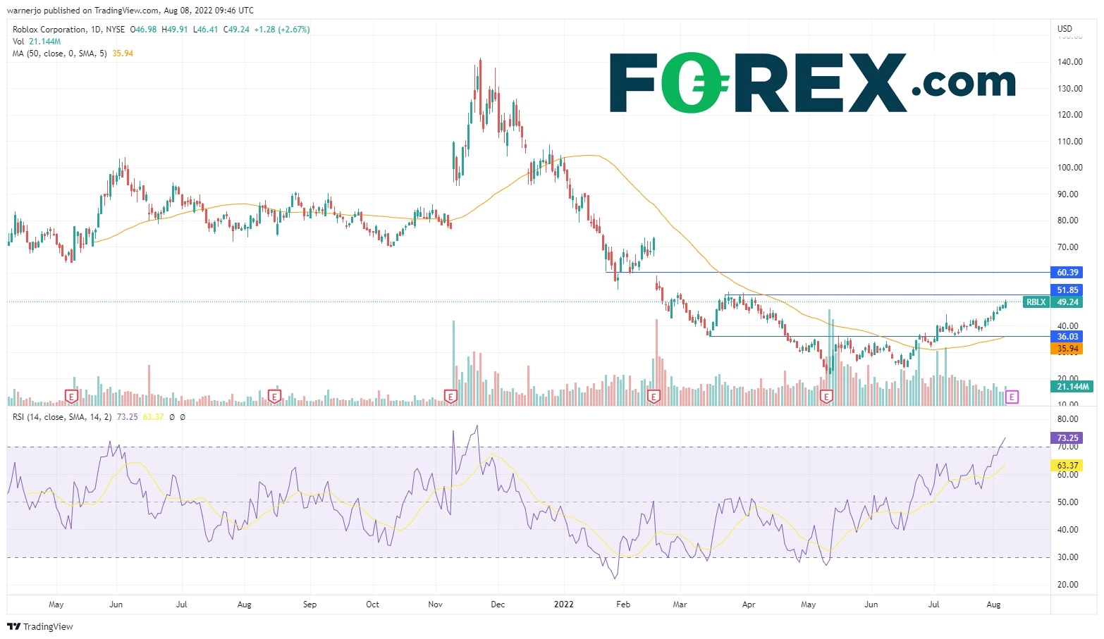 Roblox股价在过去三周一直处于上涨趋势中,到达5月创下的历史低点21.90的两倍多的高位。