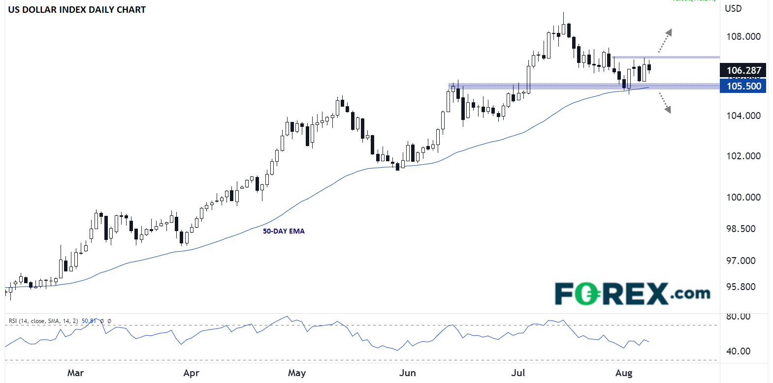 如果7月通胀高于预期,可能提高美联储下月再加息75个基点的几率,并提振美元。那样的话,美元可能站上107.00整数位并打开反击6月高点,即109.00附近的空间。与此同时,CPI报告如果疲弱,可能打击美元,致其跌破50天指数移动均线105.50附近,并可能扩大下行,下探104.00。