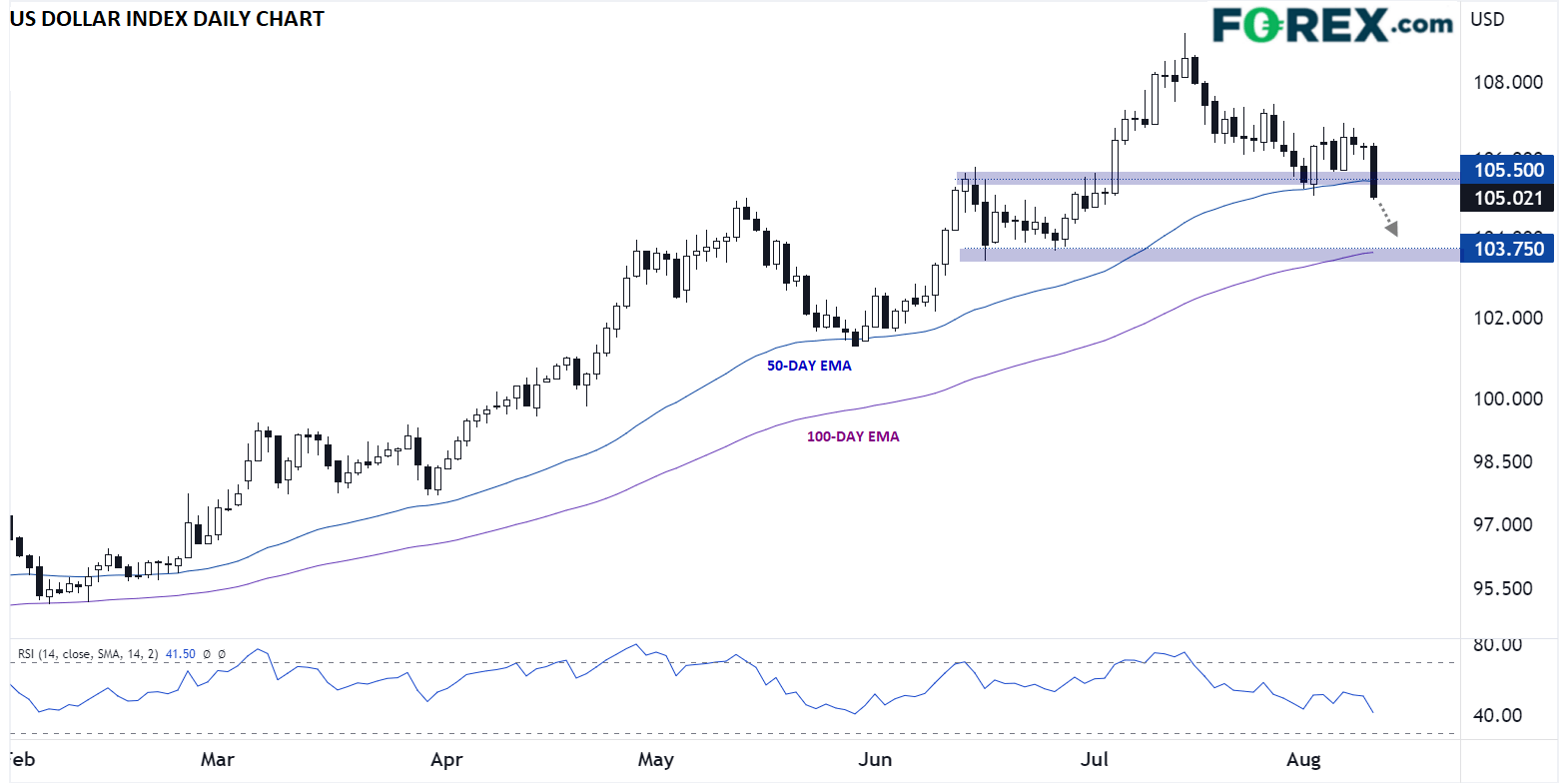 上述数据发布后美元毫不意外地承压暴跌,衡量兑所有主要对手货币走势的美元指数下挫近100点子。如下图所示,美元指数蓄势收于50天指数移动均线下方,是2月以来仅有的第二次。如果收于当前价位附近,后市或扩大下行,目标100天指数移动均线103.75附近。