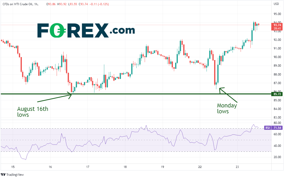中国在周一早上下调1年期和5年期贷款报价利率,并且宣布计划向陷入困境的开发商提供290亿美元的专项贷款。这些举措都是为了激励经济增长。除了通胀加剧引发全球经济衰退的关切之外,现在又多了中国房地产市场崩盘的广泛担忧。另外市场盛传,伊朗-美国协议终于有望敲定,从而增加市场供应。该消息导致油价下跌,西得州原油在周一早上下挫4美元,至86.26低点,一度考验8月16日低点85.72。但就在数小时后,OPEC+新任负责人表示,OPEC目前正面临剩余产能不足的普遍困扰。油价因此调头向上,西得州原油收复所有失地,收高57美分,报在90.44附近。今天,油价继续上涨。有OPEC官员表示,如果全球经济衰退,则支持减产。西得州原油价格目前报在94.00附近。