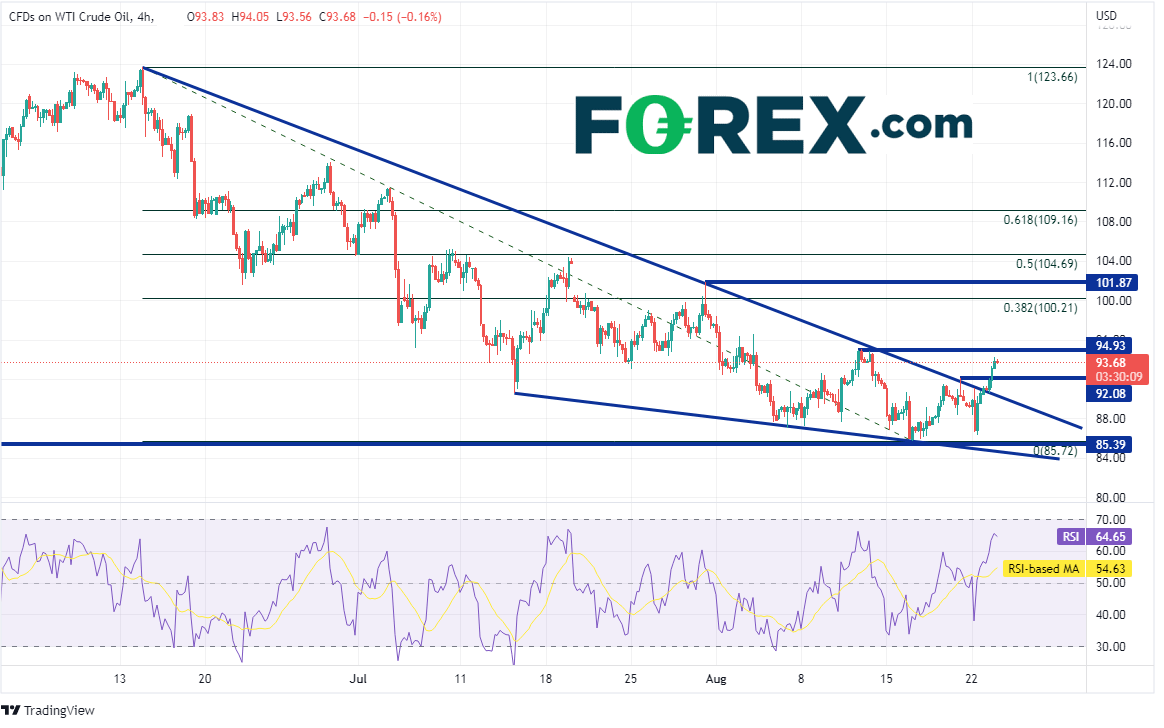 西得州原油4小时图最近站上一个下降楔形。上方阻力先后有8月11日高点95.04、6月14日高点到8月16日低点行情的38.2%回档位100.21、水平阻力位101.87。但如果接下来披露的经济数据导致衰退担忧战胜供应收紧的关切,则油价可能下跌。下档支撑先后落在8月19日高点92.08、楔形的下降趋势线90.30附近以及8月16日低点85.72。