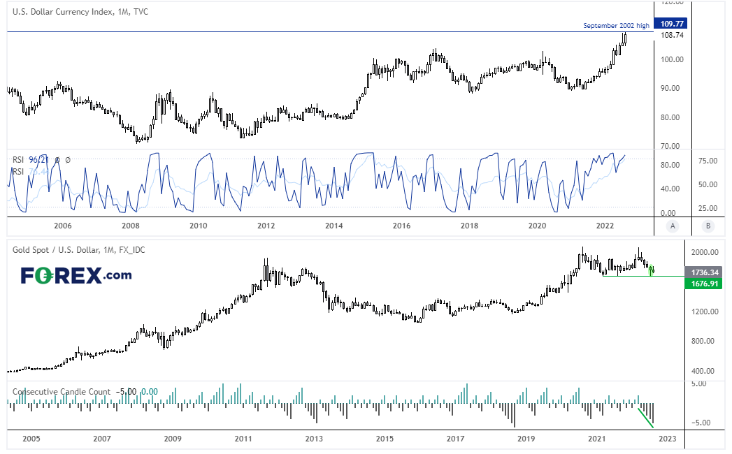 首先,浏览“连续K线计数”指标后我们发现,上述这样的序列并不常出现。所以,我们有望走向“上升”的月份。2021年到目前为止,1676一直是可靠的支撑位,伴随着上月看涨锤子K线。其次, 美元指数反弹止步于2002年9月高点下方不远处,也是黄金多头可以抓住的一线希望。