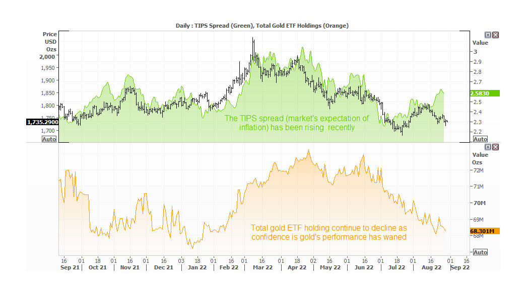 第三,美债与通胀保值债券的收益率之差(TIPS spread)在扩大,值得警惕做空策略。该指标被视为市场对通胀预期的看法,于7月6日形成低点,金价随后在当月21日也形成低点。下图的下半部分展示了黄金ETF持仓不断下降同时金价承压下挫,但方向滞后于黄金。所以,我们更愿意关注TIPS之差,用以判断黄金的潜在方向。