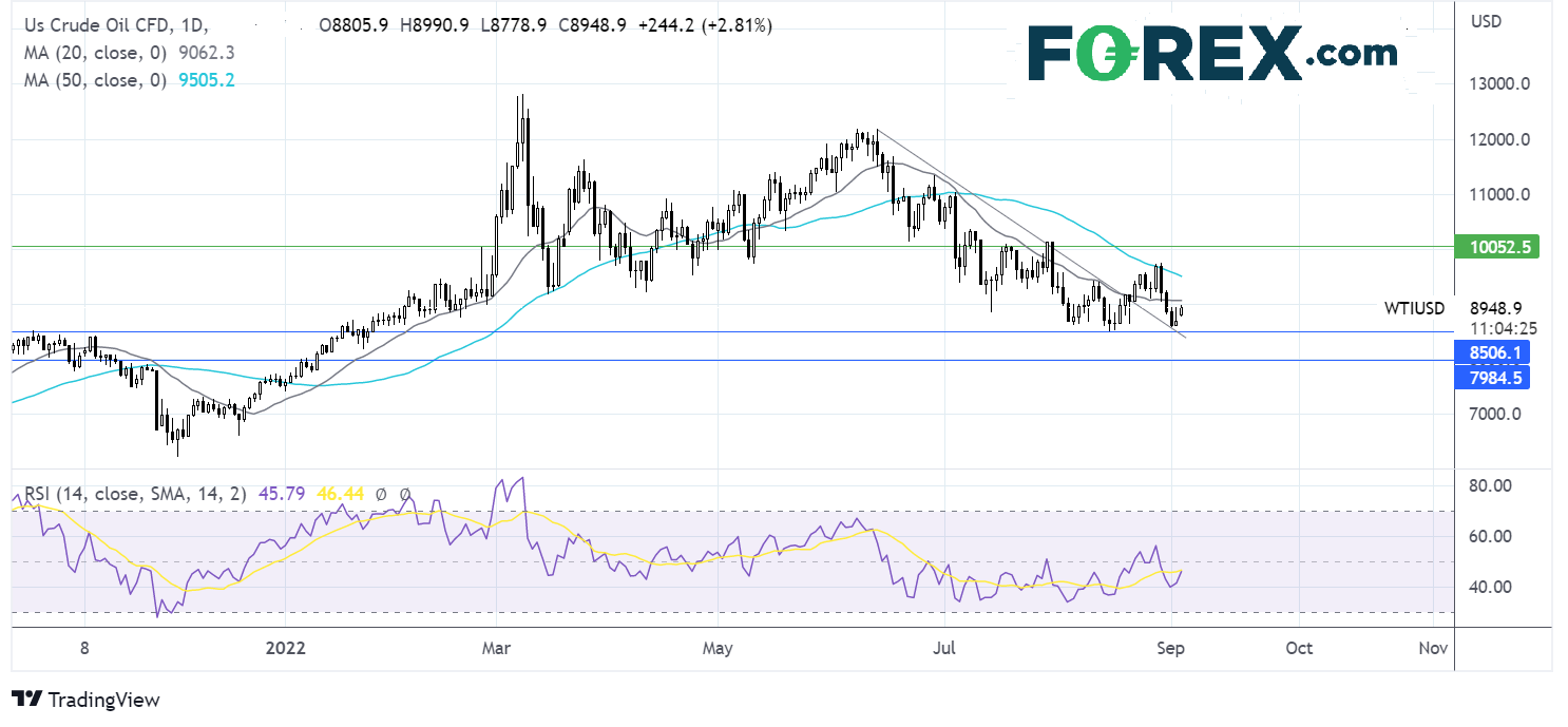 油价在持续数月的下降趋势线处企稳,目前试图反击。油价需要站上20期均线90.55,才有机会上看50期均线95.00。如果站上上周高点97.00,可形成一个上抬的高点,剑指100.00心理大关。与此同时,空头的目标可能是下破8月低点85.00以及下降趋势线支撑,下看80.00整数位。
