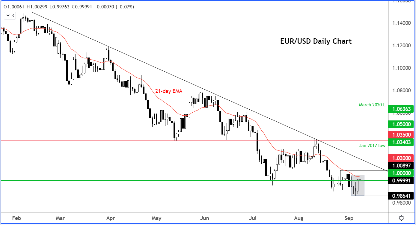 如果看涨,读者有必要关注欧元/美元的收盘价,届时交易员已经消化了欧洲央行决议、拉加德在新闻发布会上的讲话以及鲍威尔的演讲。如果收盘价远高于平价,多头未来几天或有机会。价格目前严重超卖而美元严重超买,欧元/美元当然有喘息的机会。
