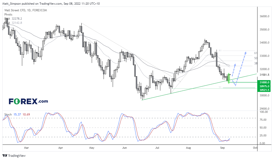 道指已对6月低点以来反弹行情展开相对深度的回撤,过去两个时段两次假性下破趋势线支撑。而且,昨天形成的看涨吞噬K线表明31000上方不远处筑有买需。随机震荡指标同样超卖,但重新回到30上方,发出传统意义上的“买入信号”。