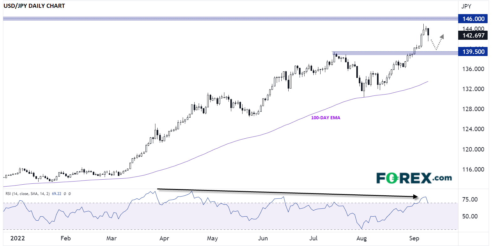 综上,从某种程度上看,周二的通胀读数的市场影响或许有限,但仍构成本周最为重要的经济数据发布。来看2022年外汇市场的主流趋势:美元/日元的涨势。价格上周在146-147区域的1998年高点下方调头回落,并且在几乎完全计入的加息75个基点前景与日本央行多年来措词最为激烈的口头干预夹击之下,回落势头可能延续到月中。