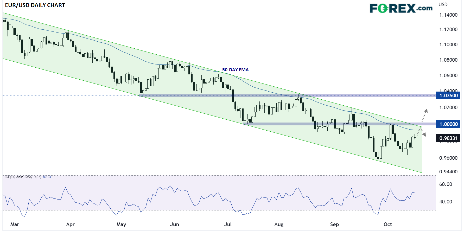 如果期待欧元/美元逆势反弹,0.9950-1.0000区间值得关注,下行通道上轨、50天下跌移动平均和关键心理平价位阻力均在此汇合。如果欧元/美元价格突破上述关键阻力区间,将是18个月来首次在日线图构筑上抬的低点和上抬的高点,同时延伸目标看至9月中1.0200高位,甚至达到1.0350的前支撑转阻力位区域。