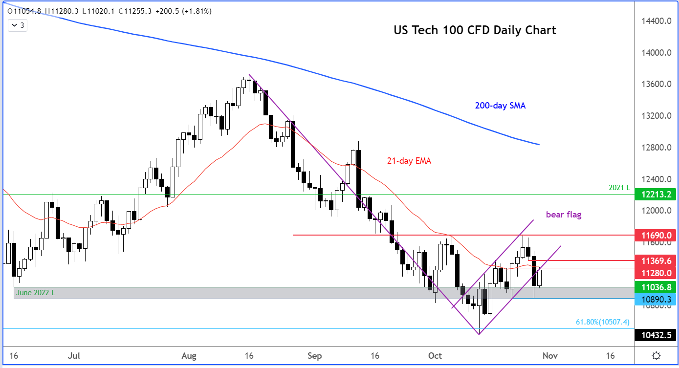 在科技股财报发布后,纳斯达克指数已经突破了它的熊市上升旗形,呈现跌势延续的态势。只要指数没有回升并保持在关键阻力位11370上方,就可能会导致新的技术性抛售。
