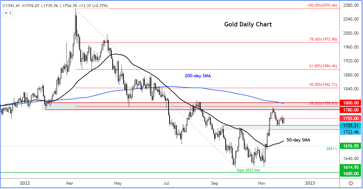最近几天,黄金一直在两个主要区域之间停滞不前。上行受制于$1780至$1800附近的强大阻力,这里曾是200日平均线(现在向下倾斜)和相对于今年高点的38.2%斐波那契点位形成的支撑位。目前,下行则在之前的阻力位$1722-$1735区域获得支撑。