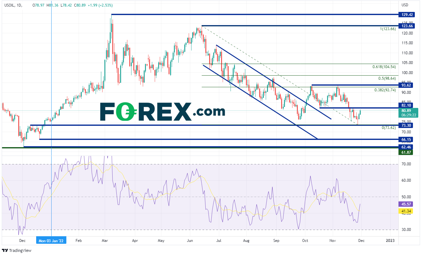 如果OPEC+保持产量不变,一旦需求增加,价格将会上涨。如果价格继续走高,阻力位于10月17日以来的低点82.10。在此上方,价格可能会在前期高点和6月14日高点到11月28日低点区间的38.2%斐波那契回撤位之间挣扎,即92.74和93.62。下一个阻力位是同一区间的50%回撤位98.64。如果市场预计全球经济可能衰退,需求将下降,那么价格就会下跌。第一支撑位于2021年12月下旬以来的高点73.30,然后是之前的低点66.15和62.46。