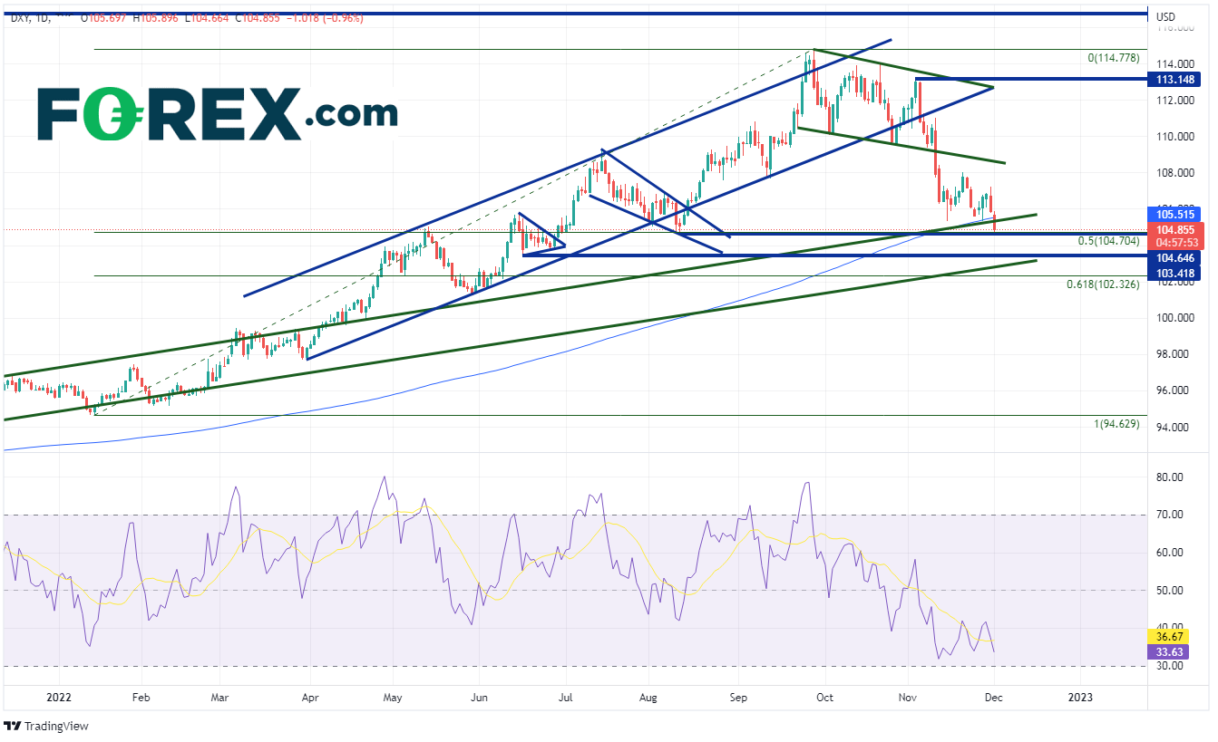 美元指数在9月28日创下114.78的高点,形成了对3月以来所处的上行通道的假突破。接近80的RSI处于超买区域,这是美元指数可能回调的信号。美元指数果然回落,直到11月4日非农数据走强之后才止跌。11月10日,当天公布的CPI低于预期,美元指数再次大幅下跌。该指数跌破109.25附近的下行趋势线并继续走低。在鲍威尔于11月30日就放缓加息步伐发表鸽派言论后,美元指数进一步下破200日均线、趋势线支撑,正在测试水平支撑位和1月14日低点至9月28日高点的50%回撤位104.70附近。如果价格继续走低,下一个水平支撑位于104.65,然后是103附近的上行趋势线。在此下方是前述区间的61.8%斐波那契回撤位于102.36。