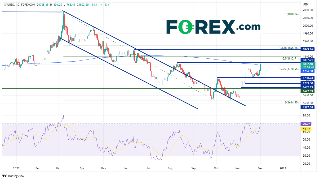黄金在9月28日创下低点1614.95。该贵金属随后在1615和1731之间波动,直到11月3日,多次测试之前的低点。我们注意到黄金创下年初至今的低点时,RSI处于超卖区域。11月4日,在非农就业数据强于预期之后,黄金大幅走高。11月10日,低于预期的CPI公布当天,黄金再次大幅走高,随后涨至3月8日高点到9月28日低点的38.2%斐波那契回撤位1789附近后才偃旗息鼓。然而,在鲍威尔于11月30日就放缓加息步伐发表鸽派言论后,黄金再次开始走高。12月1日,黄金突破了前述区间的38.2%斐波那契回撤位和200日均线,然后冲向8月10日高点1807.91附近的水平阻力位。如果黄金继续走高,下一个阻力位在前述区间的50%回撤位1842.71,然后是6月13日高点1879.16。在此上方,下一个阻力位是61.8%斐波那契回撤位1896.46。