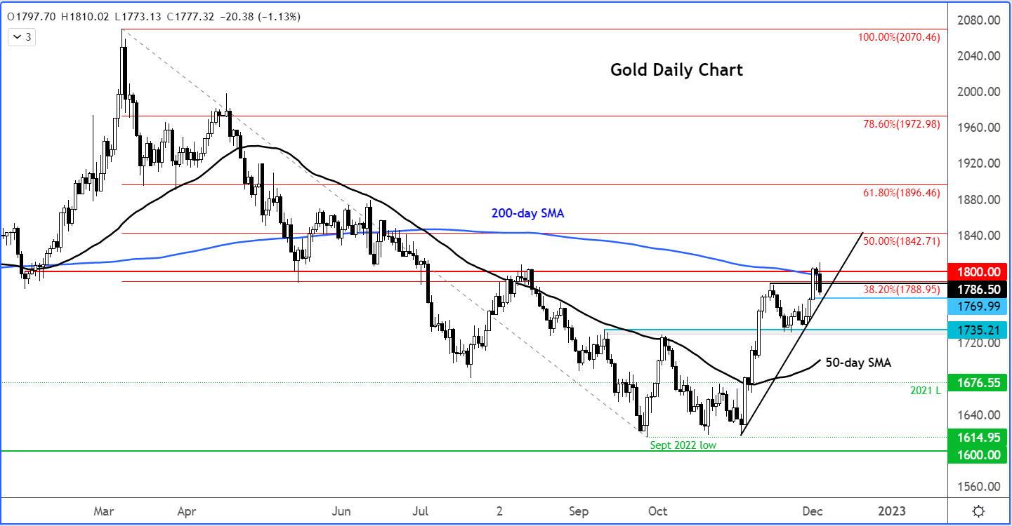 截至撰稿时,日线图可看出黄金形成看跌吞噬K线,展现出日内反转潜力。再结合之前黄金未能守住1800美元关键位的情形,形势变得愈发有趣。1800美元之前是黄金的主要支撑位,但随着金价在7月回落后,又为黄金提供充足的反弹空间。同时200天移动平均线也在这一水平出现。
