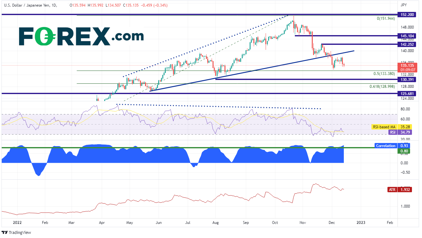 在以美元/日元图表为例,美国两年期国债收益率与美元/日元相关性高达+0.93。相关性系数高于+0.80则视为强正相关性,因此这两大资产的走势很可能趋同。美元/日元低点为134.51,高点135.99,波动区间为148点子。美元/日元的真实波幅均值(见表格底部)为193点子。FOMC会议召开原本是市场重要活动,结果并未引发市场剧烈反应,美元/日元交投价甚至未突破真实波幅均值。