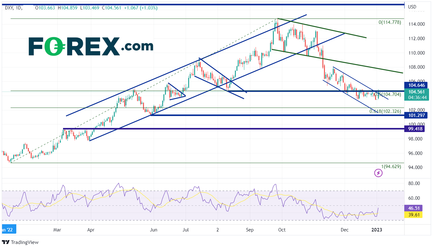 美元指数今年开局良好,上涨1%至104.50附近。DXY在2022年的大部分时间里上涨,从1月14日的94.63涨至9月28日的114.78!然而,在第4季度,该指数回落至略高于涨幅50%的点位,全年收于103.49。11月10日,CPI数据远弱于预期。因此,DXY从110.30下跌至11月底的106.28。自此,该指数形成了下行通道,直到年底。今天,在2023年的第一个交易日,DXY突破了通道的下行趋势线,并回到了前面提到的50%回撤位104.70上方。美元是否会在2023年继续走高?