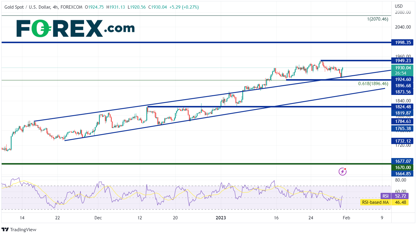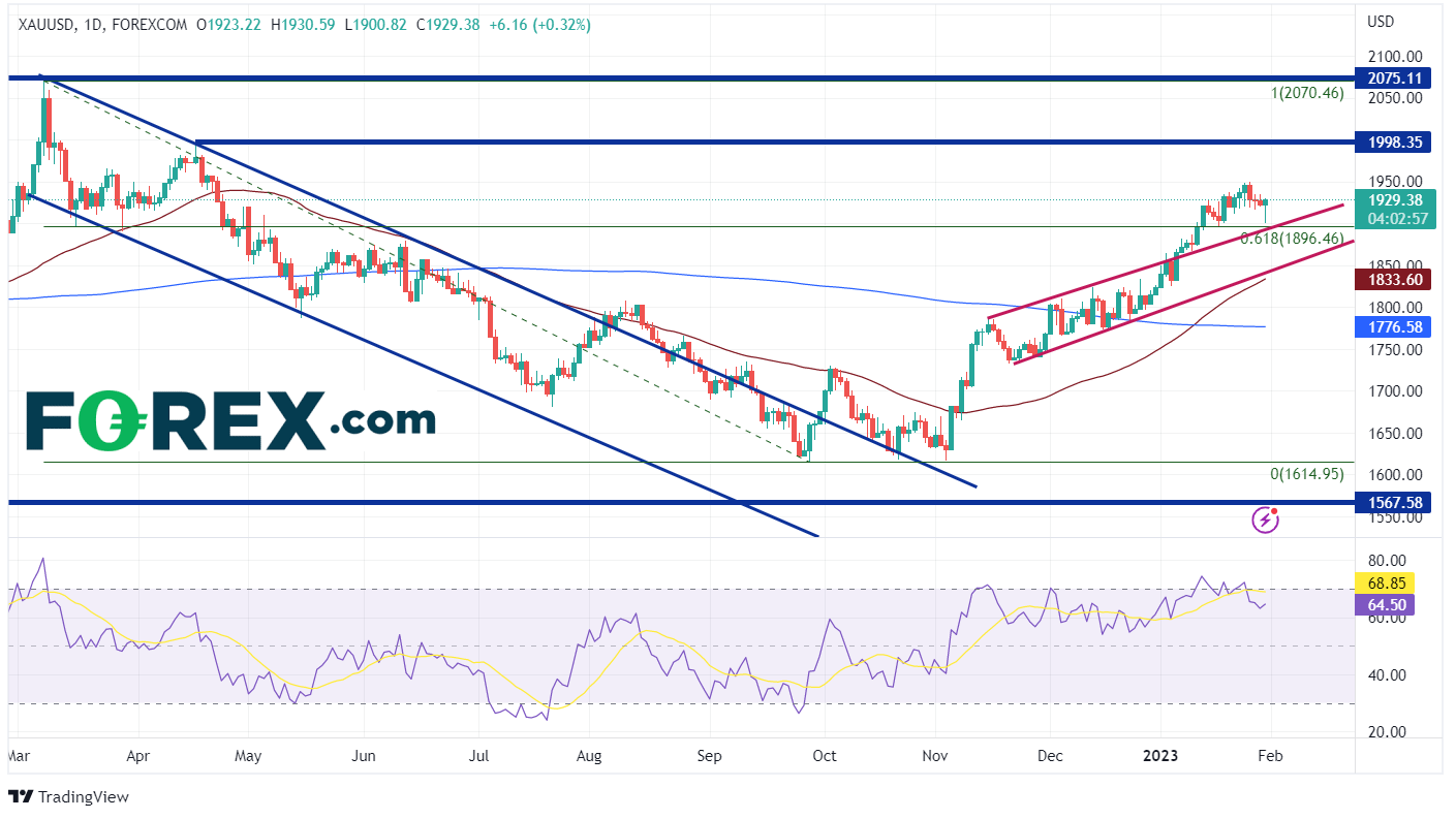 在日线图上,黄金在下行通道中稳步走低,从2022年3月8日的2070.46下跌至2022年9月28日的1614.95。9月30日,黄金横盘整理打破通道,然后开始积极走高。黄金交投于50日移动平均线上方,并在2022年底形成新的上行通道,收于1823.92。1月6日,黄金突破通道顶部趋势线,然后突破从2022年3月高点到2022年9月低点区间的61.8%斐波那契回撤位1896.46。1月26日,黄金创下1949.23的高点,随后在明天的FOMC会议前获利回吐。