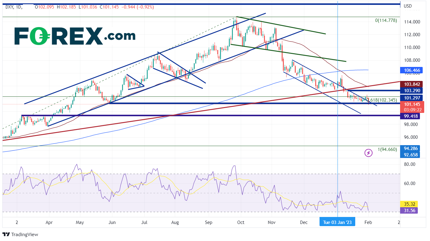由于会议不够鹰派的言论和会前的市场定价,美元随即遭到抛售。美元指数(DXY)大幅走低,回到近期通道的顶部趋势线下方,低于2022年5月30日的水平支撑位101.29。DXY的下一个支撑位在心理整数支撑位100.00。低于该点位,价格可能会跌至2022年3月的支撑位99.42附近。要想扭转跌势,它得回到昨日高点102.60上方。下一阻力位于1月12日的高点103.29。