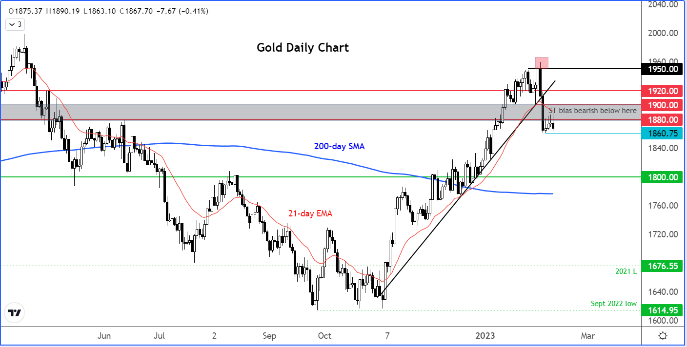 黄金交易员将密切关注即将发布的美国数据,期待黄金能走出盘整。未来,我们将在周五密切关注密歇根大学的美国信心调查,随后是下周的CPI。近几个月来,密歇根大学消费者信心和通胀预期调查一直备受重视,因为投资者期望能抢在美联储之前预测政策变化。如果我们看到公布数据明显偏离预期,这将会大幅推动美元、黄金和股市。美国消费者通胀数据将于下周二公布。美联储对通胀持续下降的回应是将加息步伐放缓至25个基点。看来美联储将于3月再次加息,然后暂停。但在远超预期的就业报告之后,再加息两次的可能性飙升。如果CPI转而升温,那么这可能会进一步提振这些预期。