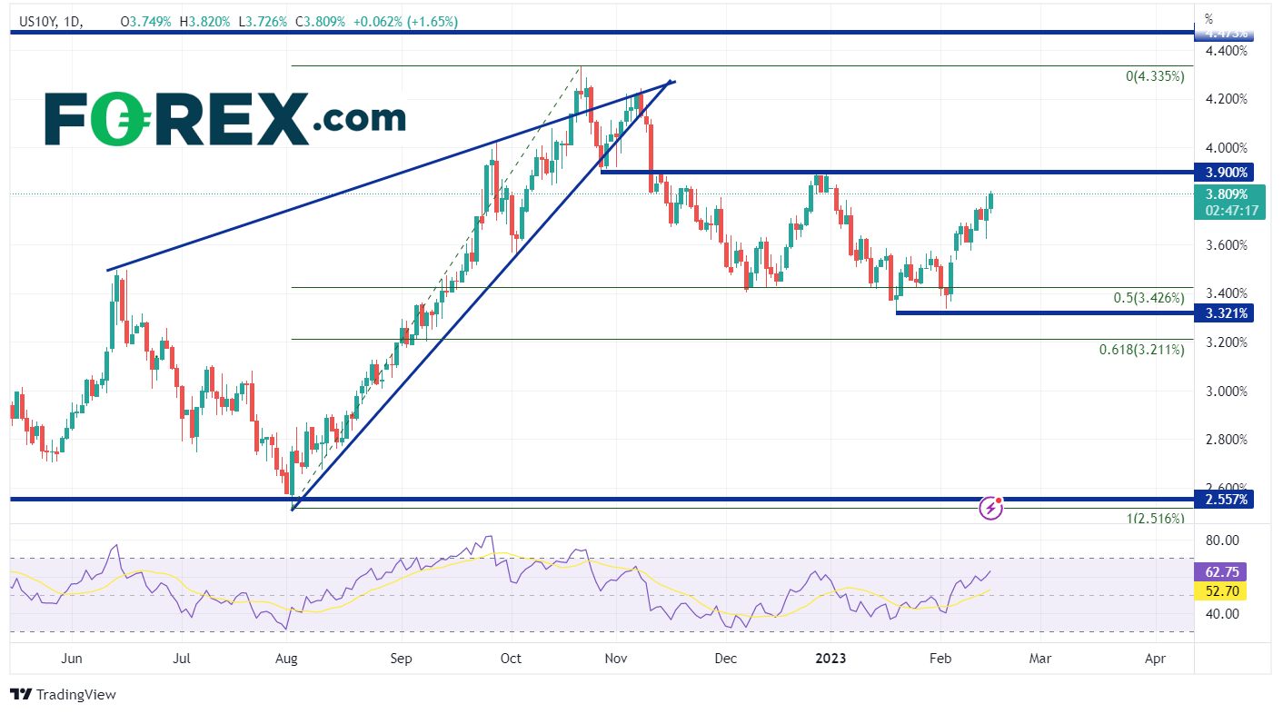 美国10年期国债收益率自8月2日以来一直在上升楔形中走高,直到突破顶部趋势线并在10月21日创下4.335%的高点。通常情况下,当价格(或在这里应称为收益率)未能在形态的一侧保持突破态势时,它通常会移向另一侧进行测试。这一关键的美债收益率最终在2022年11月10日跌破该形态的底部趋势线并大幅走低(稍作回顾,美国在2022年11月10日发布了非常疲软的CPI数据)。此后,美国10年期国债收益率交投于3.321%至3.90%之间。从2022年8月2日低点到2022年10月21日高点区间的50%回撤位为3.426%,但它已经多次充当该基准收益率的支撑位。