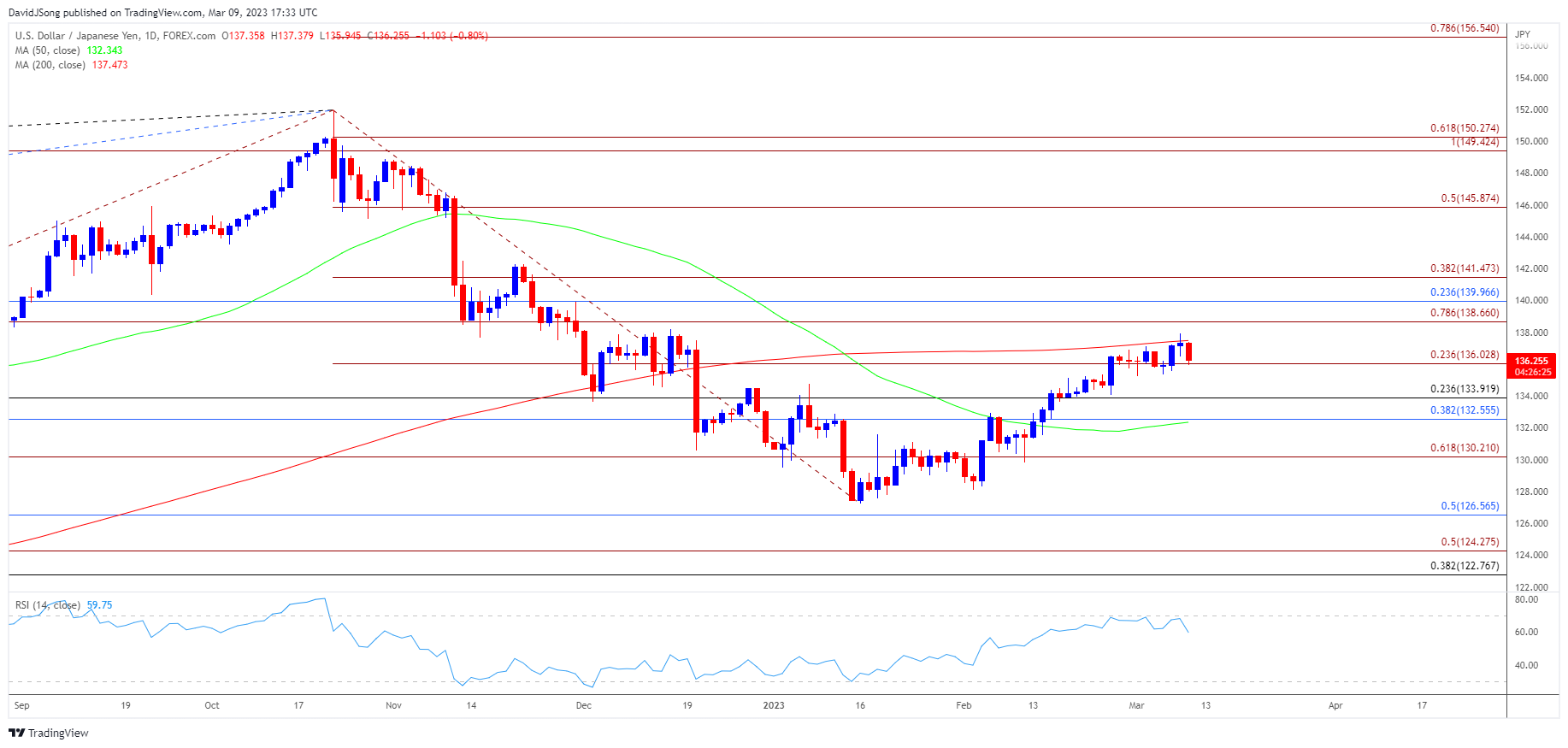 美元/日元未能测试2022年12月高点(138.18)后,打破了近期一系列更高的高点和低点走势,相对强弱指数(RSI)仍低于70,因为汇率难以保持在200日均线(137.47)上方。