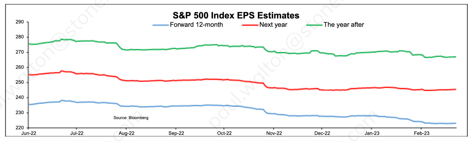 每股收益(EPS)预期不断下调:分析师现在预计2023年每股收益为223美元,与去年持平。他们开始下调对2024年和2025年的预测,预测增长率分别调为10%和20%,但还远远不够。供您参考,15倍每股收益为220,可以得出标准普尔500指数的目标价格为3,300,比当前水平低17%。