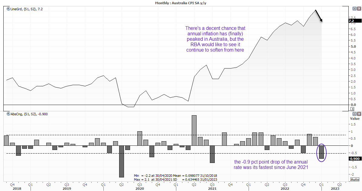 与其他国家相比,澳大利亚的通胀上升相对较晚,达到峰值也相对较晚(假设会出现峰值)。但随着上个月年化数据从8.1%下降到7.2%——下降了0.9个百分点,我们假定它相对安全。由于澳洲联储现金利率期货暗示按兵不动的可能性为95%,澳洲联储会议纪要支持罗威暂停加息的言论,暂停看来是最有可能的情况,除非我们看到周三通胀报告出现令人不悦的上升。