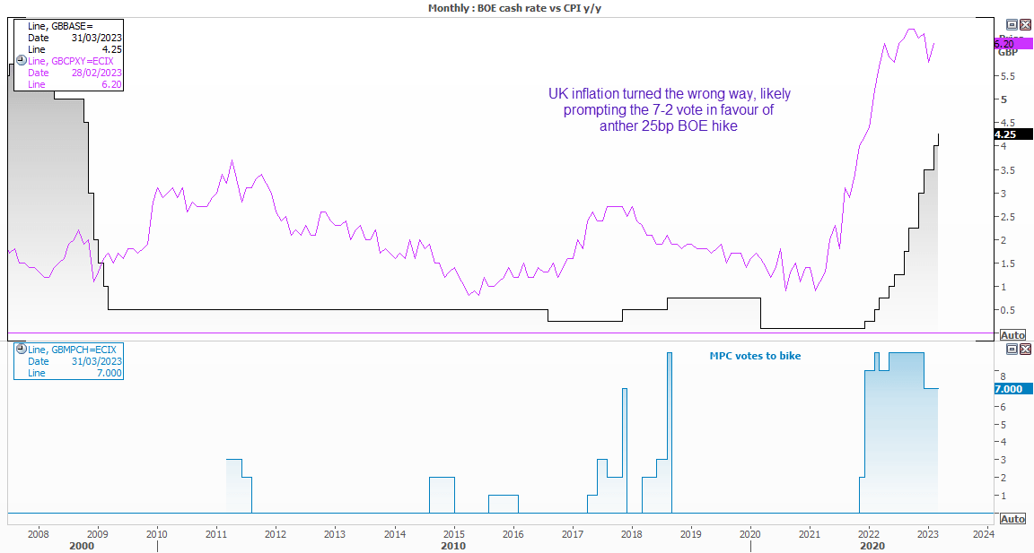 英国央行加息25个基点,而货币市场和经济学家对是否会再次加息25个基点或暂停加息存在分歧。一方面,就算英国央行的曼恩言之凿凿,预计令人不安的高通胀将迅速消退,但由于英国通胀意外上行,货币市场可能“才是对的”。我预计在上次会议上会有两个以上的持不同政见者(他们以7-2投票赞成加息),而且由于英国央行要到5月才会再次开会,因此真的不好说。我怀疑贝利也只能这么说,即强调将要公布的数据将是利率保持在4.25%或升至4.5%的决定性因素,并相应地指引英镑走势。