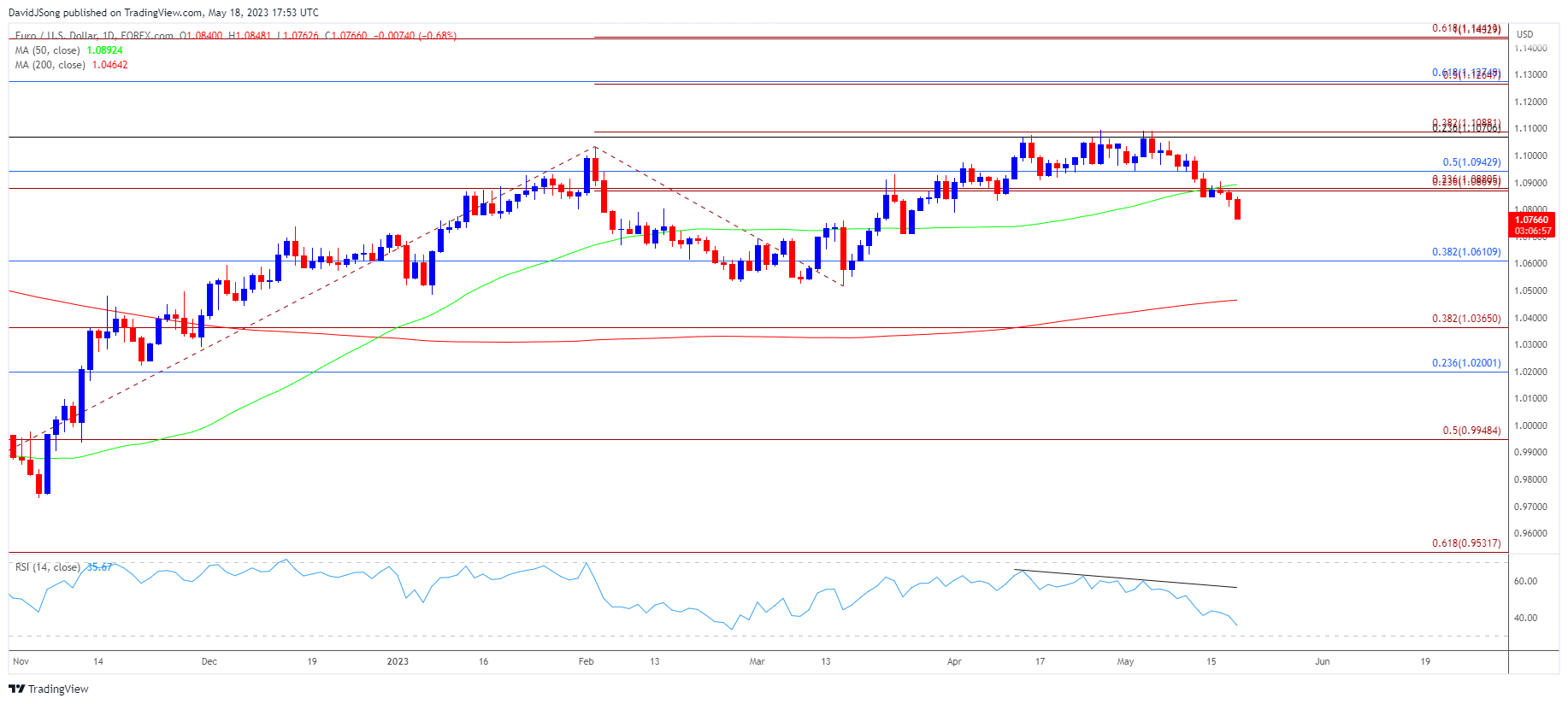 • 突破/收盘价低于1.061038.2%斐波那契回撤位)很可能会下探3月低点(1.0516),欧元/美元的进一步下跌可能会继续将相对强弱指数(RSI)推向超卖区域,因为该振荡指标仍显示下降趋势。