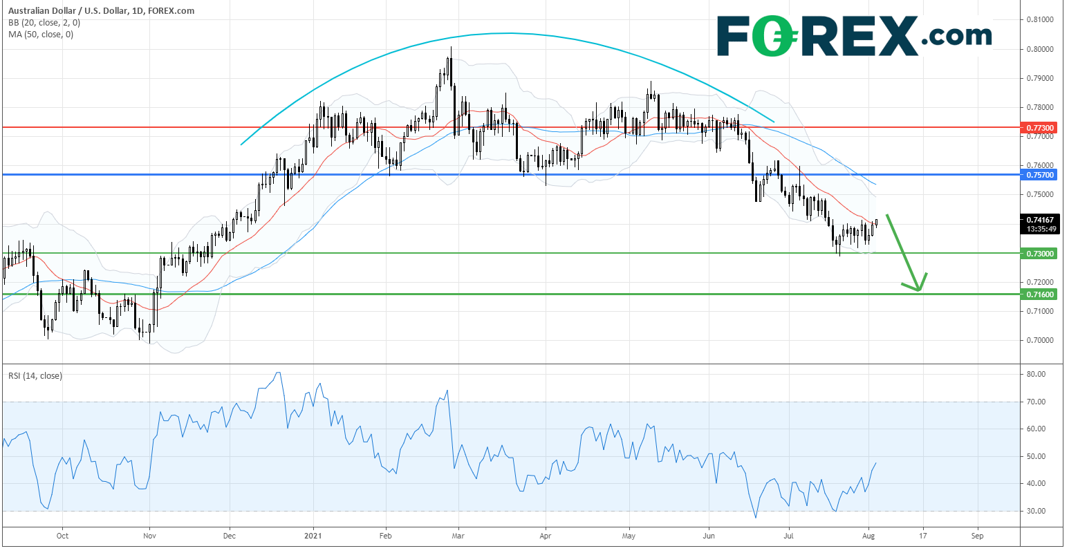 在日线图上,澳元/美元形成了一个圆形顶部后跌破颈线,随后汇价持续走低。目前,虽然汇价温和地反弹至20日均线的水平,但仍受制于下行的50日均线。