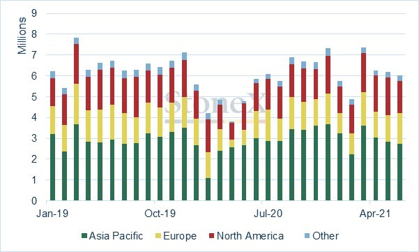 Bloomberg Intelligence目前估计, 2021年上半年全球汽车销量391万辆,相比2019年上半年增加7%。但与此同时,半导体短缺对汽车行业的影响可能在7月份显露无遗。媒体报道,法国上月汽车销量减少35%,主要原因就是半导体短缺。现在还不能据此推断整个行业的情况,但目前看来,在消耗库存后汽车生产商们下半年的运营环境确实看起来将变得严峻,而且2021年全年的销量很可能低于2019年的销量。与2019年下半年相比,2021年下半年的销量可能减少10%(甚至可能超过这个数字)。全年汽车产出因此可能减少1.5%。如此一来,汽车行业对铂金的需求可能略高于2019年,而对钯金的需求可能出现极微小的降幅。