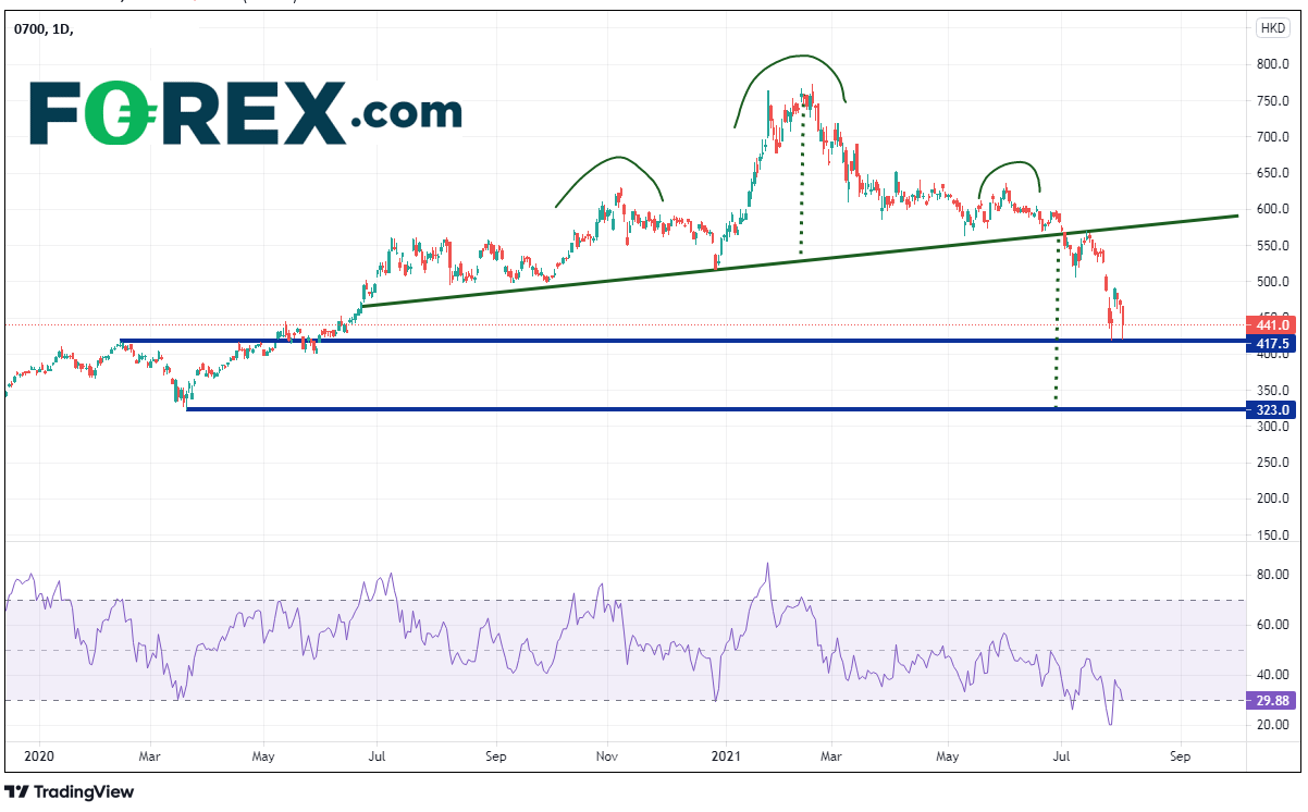 在线游戏股全线受挫,其中腾讯最为受伤。腾讯股价今天一度下跌11%,但时段尾盘反弹,当天跌幅收缩至仅6%。2020年10月以来,腾讯股价一直处于长期头肩顶形态中。价格最终在2月18日于772.50形成头肩顶形态的“头部”,随后开始走低并在6月初形成右肩。头肩顶形态的目标是颈线突破位加上头部到颈线的长度,本例中在323附近,那也是2020年3月低点。腾讯股价目前交投于水平支撑位419上方不远处。