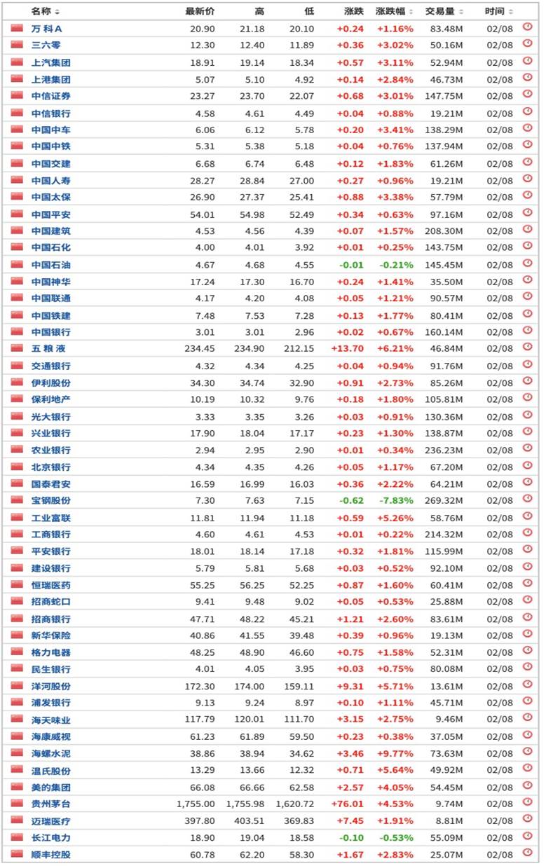 富时中国A50 成分股。来源:Investing.com